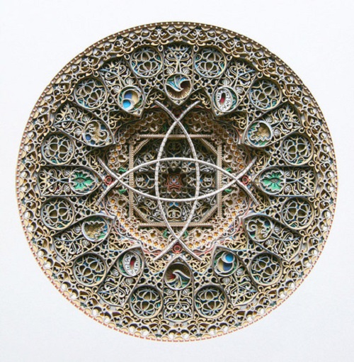 American artist Eric Standley, create an amazing intricate paper cut. Eric was inspired by Gothic geometry and Islamic architectural ornamentation, but still he has his unique individual style. Eric uses lots of layers of paper, hundred and more, roughly 1.75” deep from surface to center in order to achieve their peacefully meditative forms. The center is comprised of drawings on top of drawings with space between the two. Compositional goals are shared between these layers, but are simultaneously unique. Brilliant technique and glorious color. Elegant simplicity looks classic and precious.